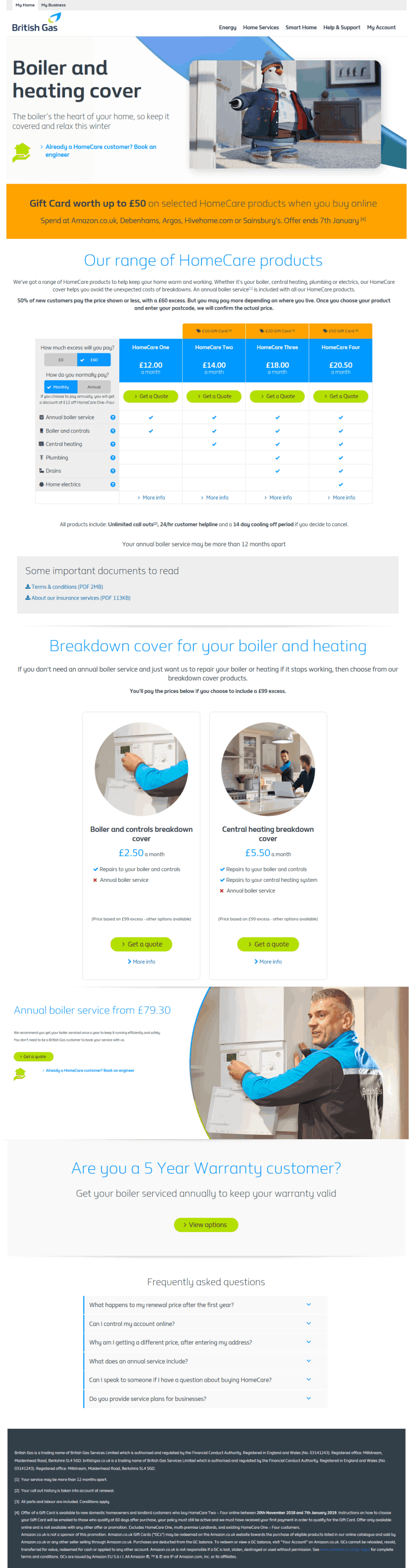 This research phase was primarily handled by our in-house UX Researcher, but we, the UX/UI team were kept in the loop and were present during all user interviews. At the time, our main activity list included getting familiar with BG's strict digital design language, brand policies and sketch components library. Afterwards, I was interested in learning about user perception of the boiler and heating subsite. So in my spare time, I presented the site to friends and family members who had same demographics as our users. I got them to perform specific tasks such as sign-up for boiler services, request boiler breakdown cover, etc I was specifically interested in their experience with the current user journey and pain points from the layout. In addition to this, back in the office, I requested access to analytics data and was able to inspect the bounce rates, conversions and user behaviour on the site. It was reassuring to discover that most of the information i collected also reflected with those gathered by our reseacher back in the office.
