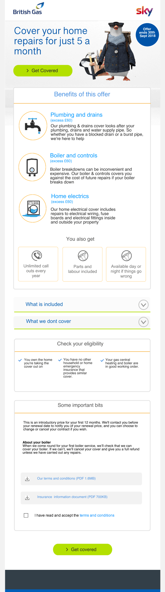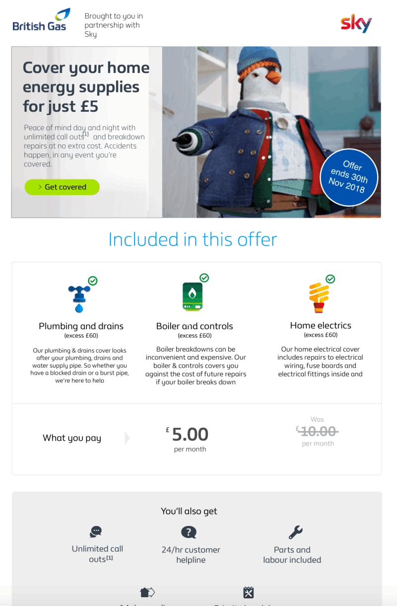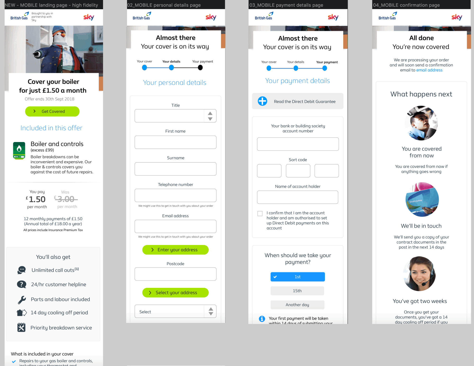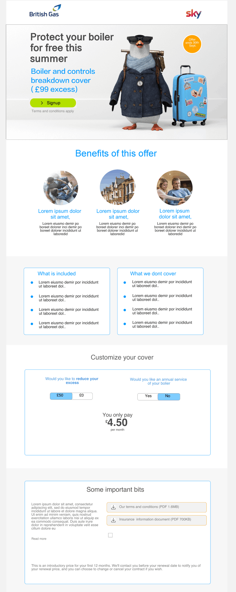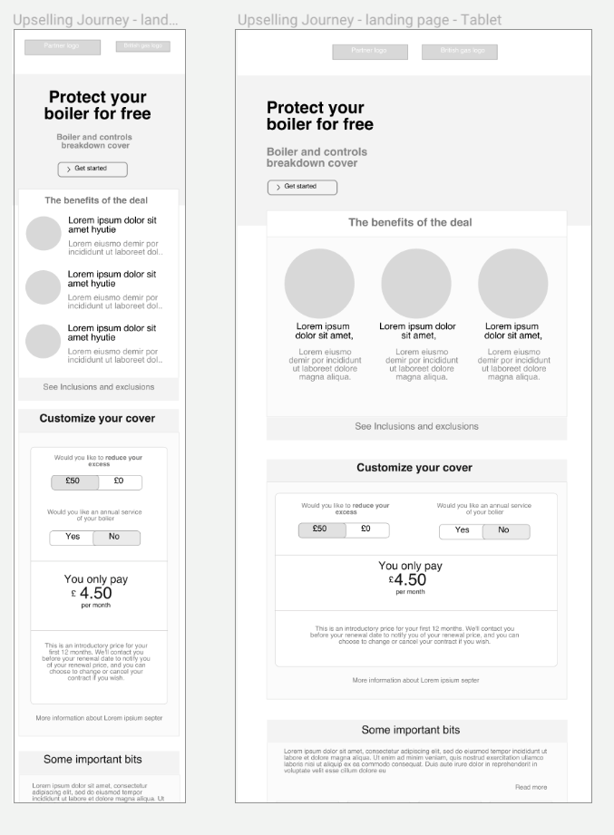 The Enabling New Partnership project focused on reviving British Gas's home energy services division as it faced steep competition from rivals during the winter months of 2018. The business had expected better performance and ultimately the dissapointing sales figures led to a new partnership initiative to address the problems. A deal was struck with other top UK businesses such as Sky and Sainsbury to work together in a collaborative marketing campaign that will give each party access to sell to the others customers'. This is a phased journey to evolve and grow new digital sales channels that will target new home energy users. The campaign also required drastic improvements to specific areas of the BG website which is were this project comes in. The project scope included improving the look and feel and user experience on the Boiler and Heating sales and services subsite to redesign the user journey, typography and layout. In addition, designing customizable promotional campaigns materials such as emails templates and banners with a focus on user needs and optimum user experience. The project team consisted of nine developers (including two front end UI developers), two Business Analyst, four Testers (two offshore), a Product Owner/Project Manager, Scrum Master, UX Researcher and two UX/UI designers -including myself. The project was based on Agile.