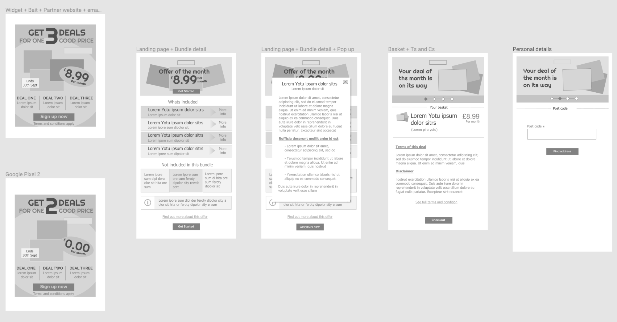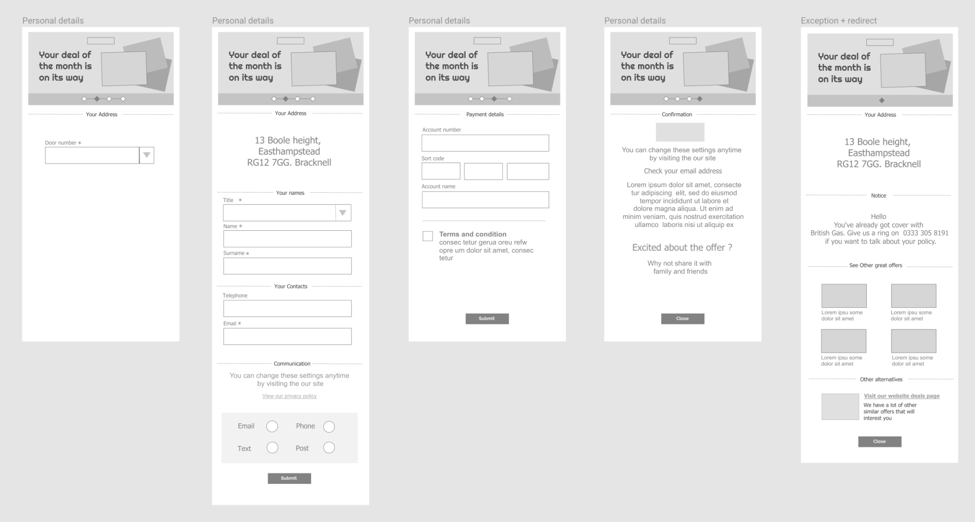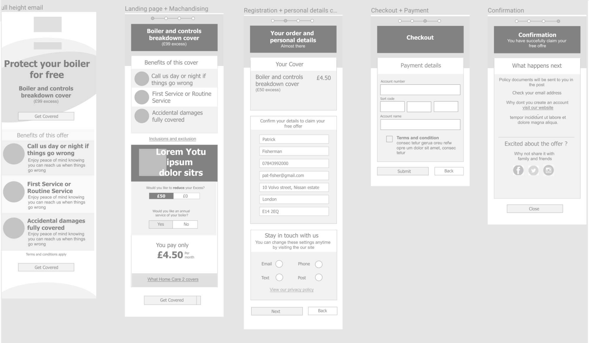 To commence preparation for testing we required clickable prototypes prepared in addition to acquiring test subjects, etc, Hence we split our activities once again so that I would prepare the clickable interface while my colleague reserved a place at BG's user testing lab and commenced the process of recruiting suitable test candidates using and agency online. To complete my task, I exported the .sketch file into Axure RP using a plugin acquired online and commenced transforming the UI to clickable prototypes for mobile tablet and desktop. We had a total of 10 users (covering the demographics we had set out earlier in the project). They were engaged over three testing sessions. During the tests we switched roles between observer and interviewer and ensured that the whole team were present and involved. By the end we had gathered essential insight to user perception of the pages and the journeys in question. Most of the feedback was positive including the fact that the journey was short and concise and users were kept informed through the journey. Never-the-less we had issues that needed addressing like the fact that a few users didnt scroll to the bottom of pages but clicked 'next' half-way through. In addition, for the partnership pages, there where questions regarding the two company logos at the header of the pages. Our findings were compiled into a report and presented to all stakeholders at a meeting. We also recieved opinions and input from the stakeholders after which I proceeded to apply the necessary amendements in my Prototypes in Axure. We repeated the test with fewer users and were satisfied with the responces we got this time and afterwards we recieved the go-ahead to move into development phase.