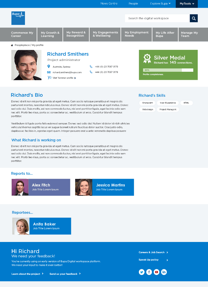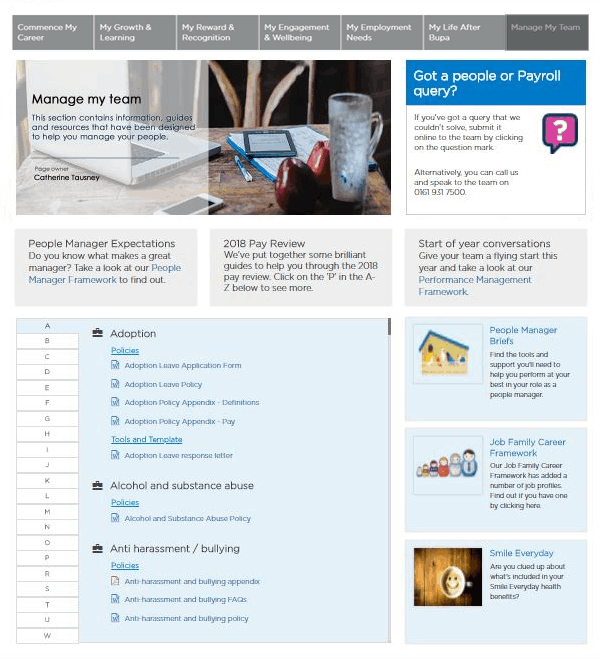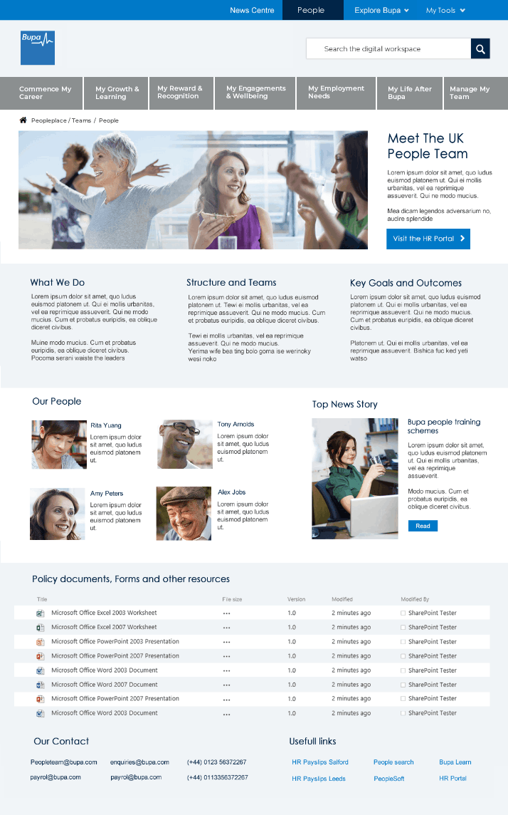 Peopleplace is a new intranet portal operated by Bupa’s human resources division. It enabled over 20000 UK employees to access and process information such as expenses, payroll, benefits, pay slips, etc. It also holds and provides access to hundreds of documents regarding policies and best practice for staff reference.