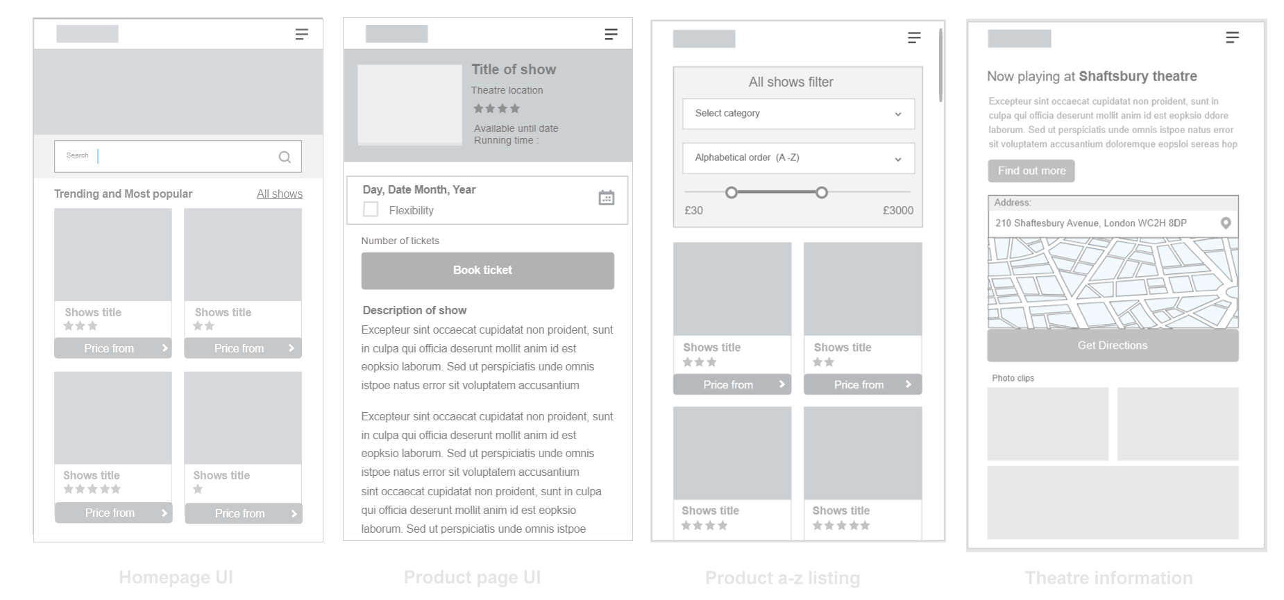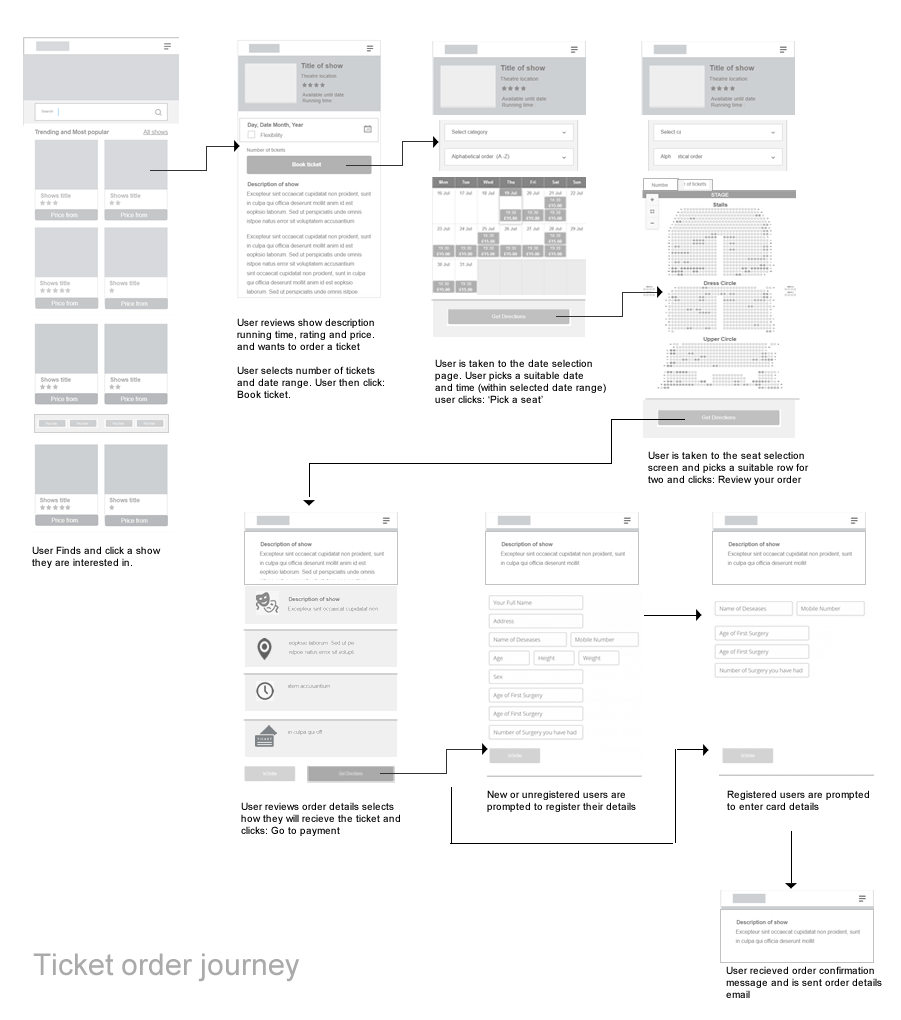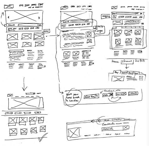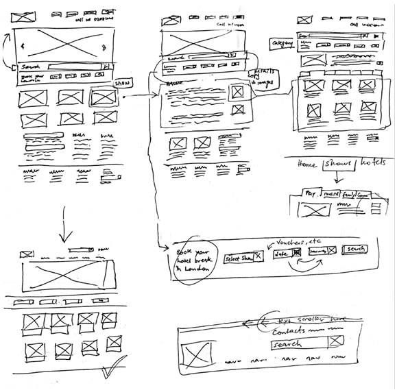 My team (consisting of a Visual designer, web master and project co-ordinator) met to plot a way forward. We had a brainstorming session where i proposed the UX strategy which was carried out in the following weeks. They included user interviews and user testing observation sessions. This was to verify my findings and ensure we were on the right track. We did this by recruiting volunteers to carryout tasks on the older sites (including purchasing tickets). In the end it was confirmed that 70% of the test subjects would bounce from the site. Afterwards, I created six personas to represent majority of our typical users. I then performed competitive analysis to learn what makes our rivals successful in order to capitalize in ways that will enable us outsell them. I noticed that most sites like ticketmaster and london-theatre-direct had a rich full width UI with immediate access to user's primary needs. (Search event by name or date). Also London-box-office. There was an emphasis on providing personalized search from the homepage. Most sites also placed accreditation and web ranking data to show their credibility. These and lots of other findings were shared back with the team for further brainstorming and discussions. I later proceeded to create process maps specifically user journeys and task flows to implement a quick and straight forward ordering process that can re-assure the user and possibly encourage a return visit when next they think about seeing a show. We were going to initiate a four step process. 1. Pick your show, 2. Pick your date 3. Pick your seat, 4. Checkout. Based on our user tests earlier, we ascertained that users often wanted to know the highest selling show of the current week or month. and with that, a list of the most popular shows. Considering the large number of shows, the homepage will use entire width area to reduce vertical scroll height. Images of the shows will be large (at least 270px height and width to present the graphics of each show in all its beauty, encouraging the user to click to find out more. These details were to be captured in the sketches and mockup which followed next.