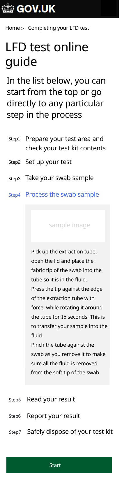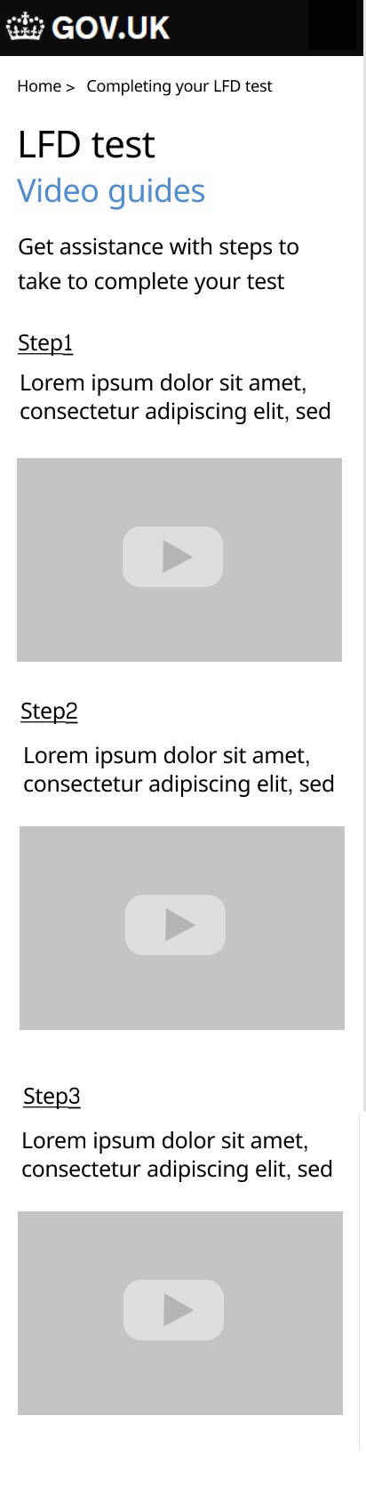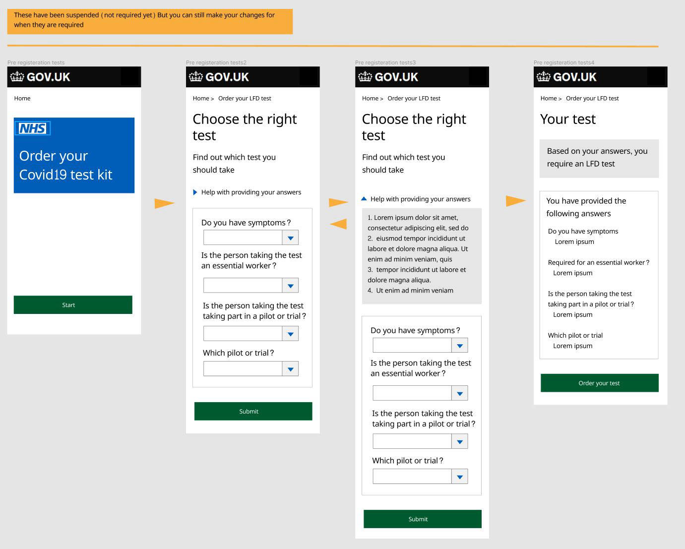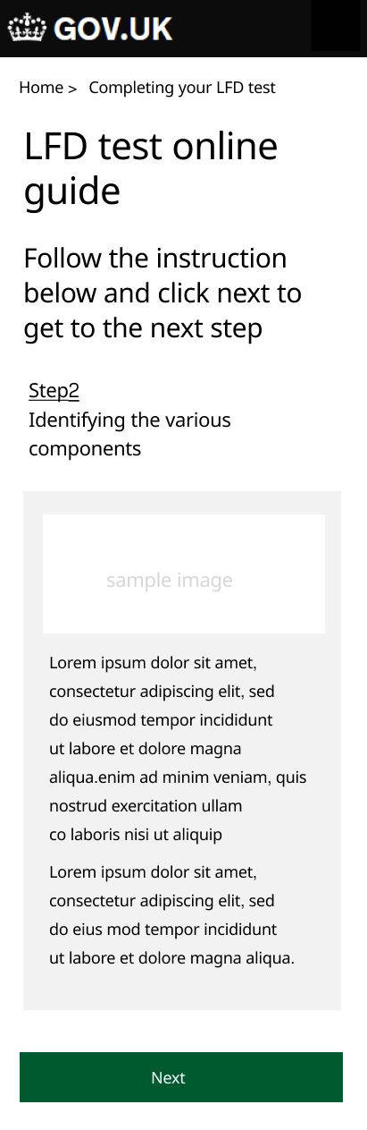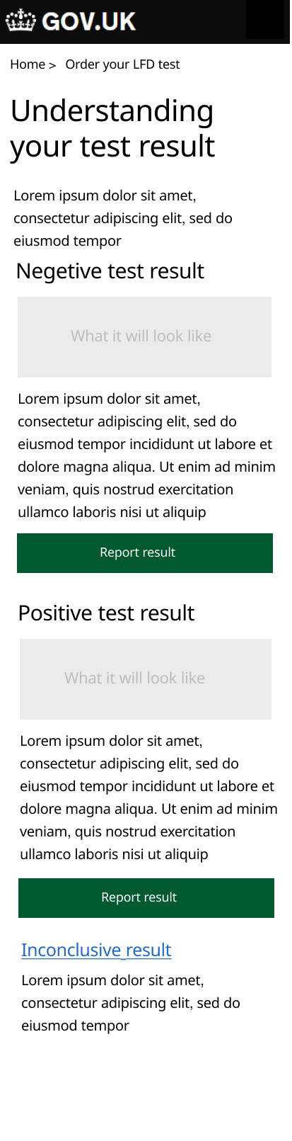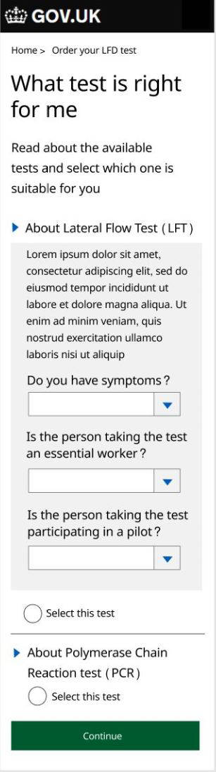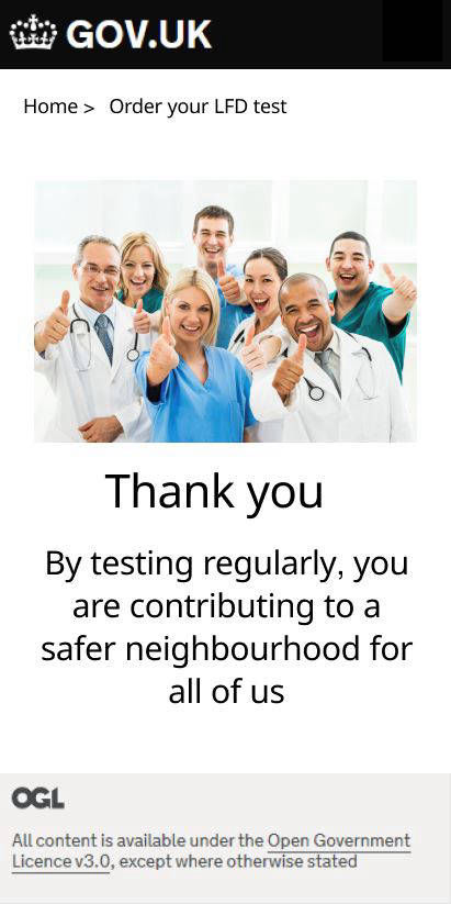 As the interaction designer I oversaw the digital journey and was very eager to kick off the design. I ran several design workshop sessions to brainstorm with colleagues then used Figma and the governments GDS principles to produce responsive (mobile first) pages in low fidelity for testing. I was very focused on delivering a seamless experience of very high standards. My aim was to keep the design extremely simple and usable for every age group. This essentially meant that there will be little emphasis on aesthetics (which is also encouraged by GDS). I took up the challenge to tackle specific issues encountered during our service delivery planning. These included (a) how to get customers to retest frequently. Test kits came in packs of 3, 7 and 14. So that it catered for families and large groups. But this was also to encourage frequent testing and there was little sign that users will comply with this. Hence i suggested incentivising users by encouraging them with phrases like. "By testing frequently, you can protect loved ones especially if you are asymptomatic". (b) Getting users to report their test results. This was in scope as it helped the NHS to track infections and provide support. It had all sorts of problems as users could fake results and we could never ascertain if it were an individual’s genuine result, not someone else's. There was no legal obligation for this, so it remained up to the customer to comply. But I applied incentives here too and the presentation was hailed by several users during the early tests.